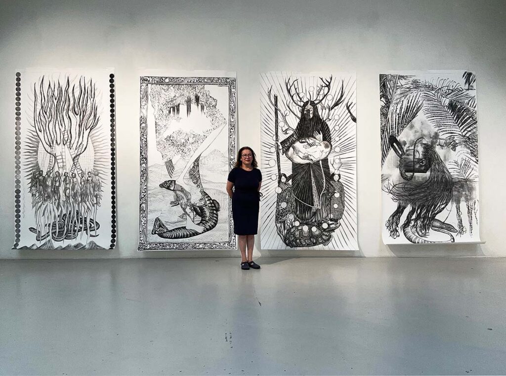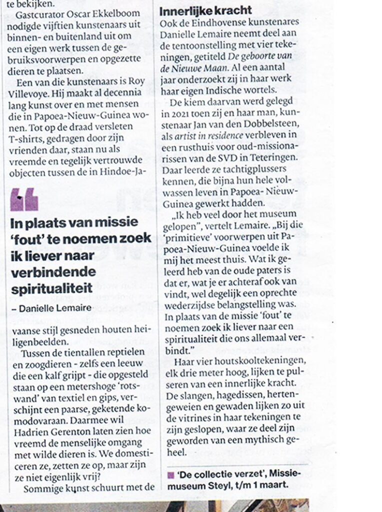 Oscar Ekkelboom: ‘Haar tekeningen verkennen natuurreligie, mythologie en kosmologie. Lemaire beeldt verhalen uit waarin missionarissen en de lokale bevolking elkaar ontmoeten en, ondanks hun verschillen, een gemeenschappelijke spirituele taal vinden.’