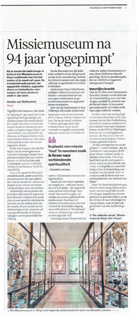 Daartoe bestudeerde ik teksten van de Tilburgse indoloog SVD-pater Piet Heerkens, die aan het begin van de vorige eeuw op Flores werkte, en putte ik uit contacten met SVD-paters en -broeders, zoals Wiel Swinkels (1945, Melderslo), die vijftig jaar in Papoea-Nieuw-Guinea (de Sepik) werkte. Mijn installatie is te zien in de ‘Primitieve afdeling’ van het museum, vlakbij de grote vitrines achterin het museum.