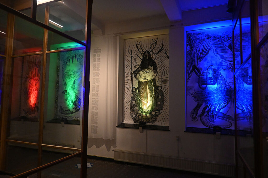 I elaborated on the story with a magical installation consisting of large printed 400 cm high endurable textile panels that hung down in the patio. Drawings and real plants were projected via two mobile overhead projectors on the panels. Performative presentations were done two times on 7 nights. The audience became part.