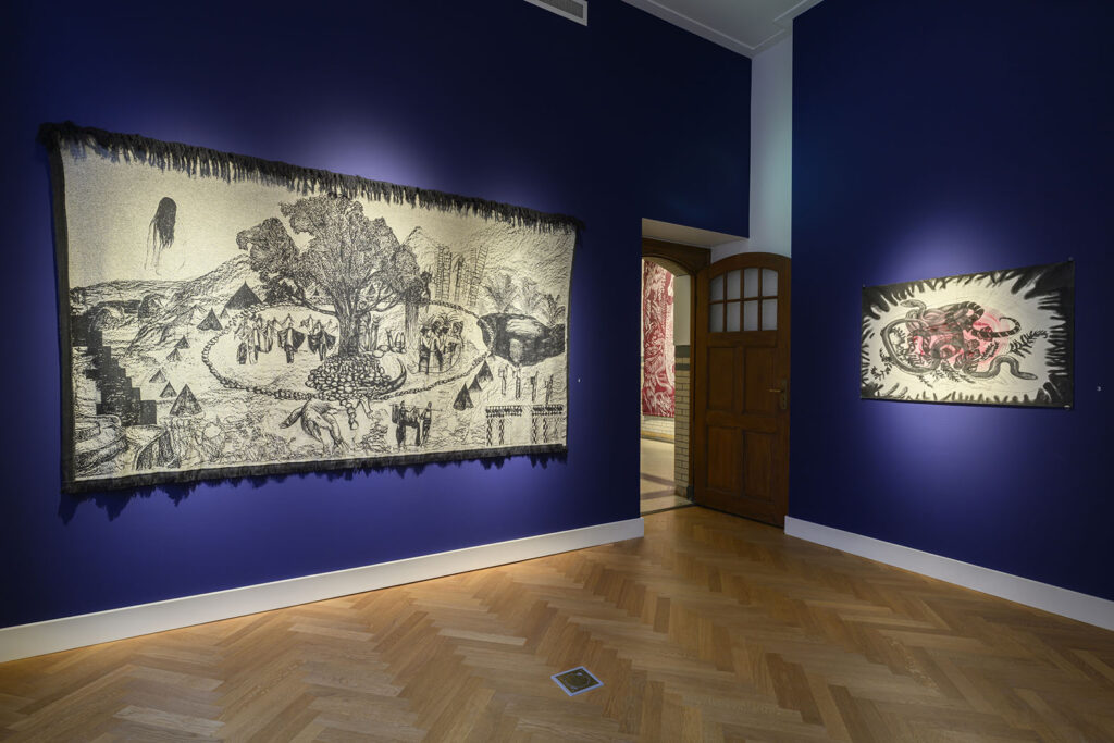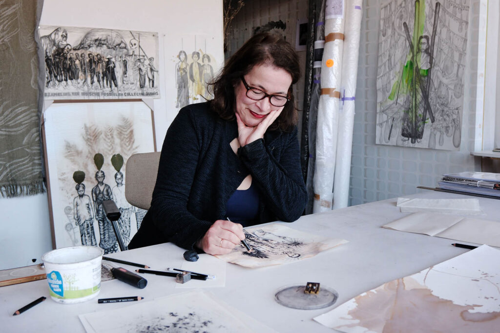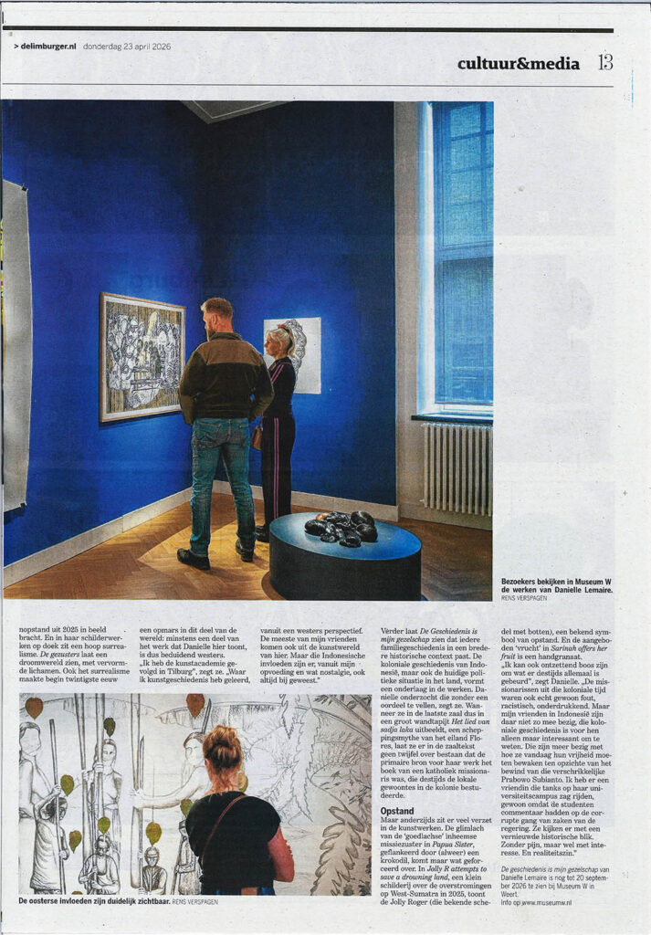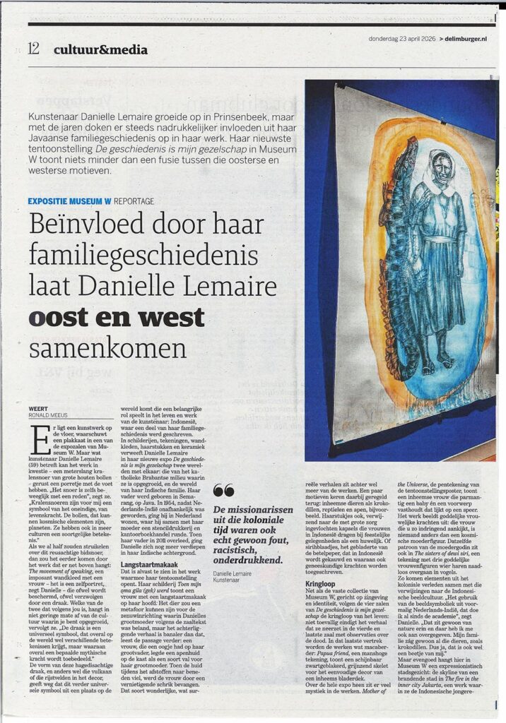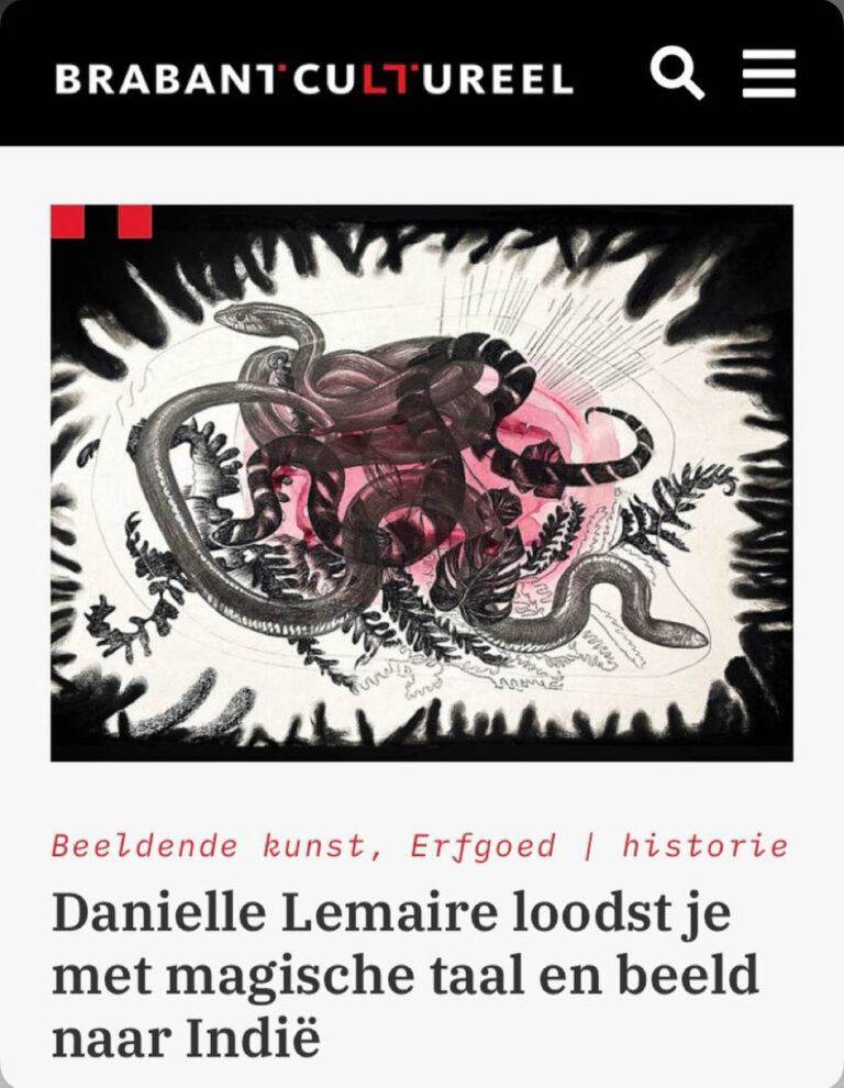 curator Oscar Ekkelboom: ‘Haar tekeningen verkennen natuurreligie, mythologie en kosmologie. Lemaire beeldt verhalen uit waarin missionarissen en de lokale bevolking elkaar ontmoeten en, ondanks hun verschillen, een gemeenschappelijke spirituele taal vinden.’